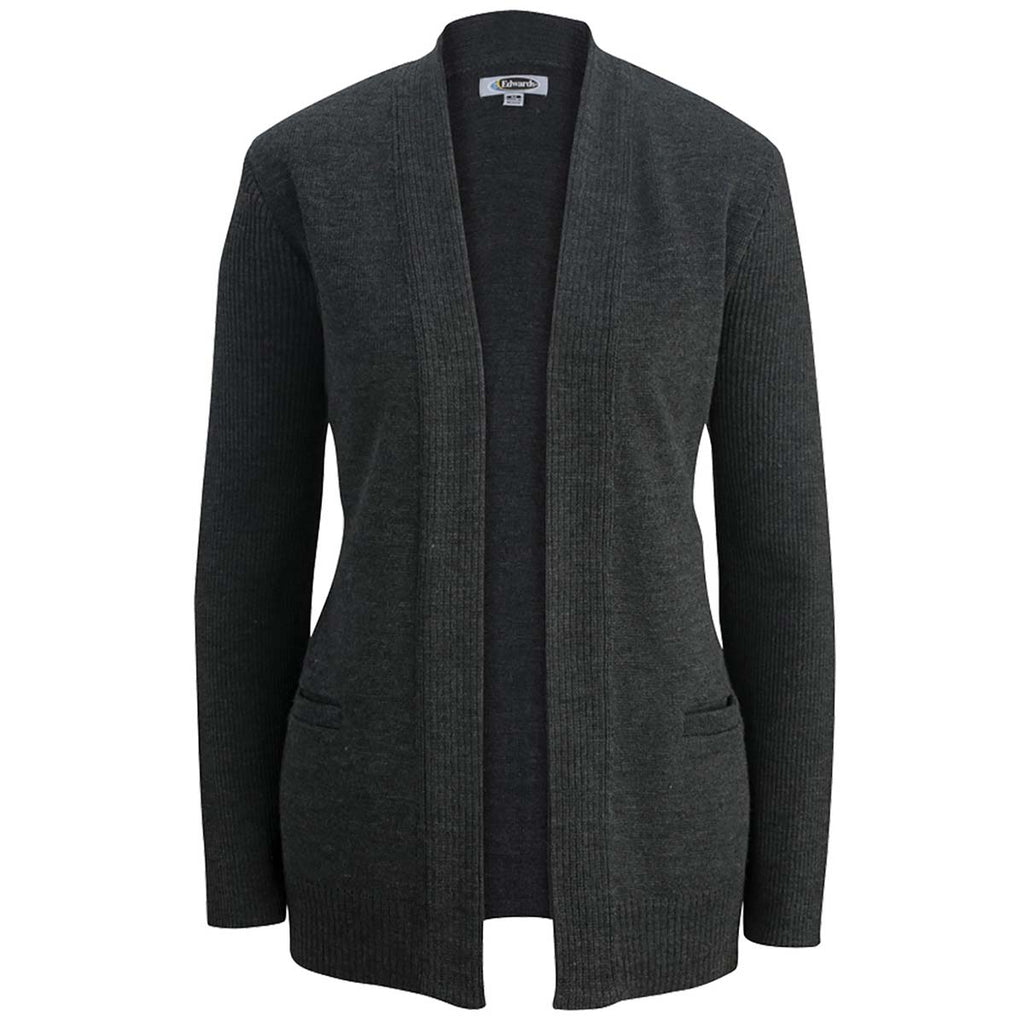 Create a custom look that will be envied with the Edwards Women's Charcoal Open Acrylic Cardigan. Made of 100% acrylic in a hip length traditional look. The open style with button free front, ribbed bottom, and welt pockets create a look that works as employee apparel or as part of hospitality apparel for those who interact with customers daily. Your corporate embroidery will stand out on the durable, high performance cardigan that can be used at home or the office with ease.Highlights