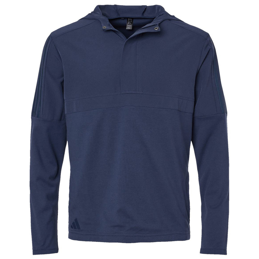 Create a corporate logo for the Adidas Men's Crew Navy Anorak for a unique look to add to your logoed apparel options. This lightweight hooded half-zip is a must-have for those that like the look of a hoodie without the bulk. It is great as a uniform at work for servers, busboys, or those in a more relaxed environment who still need to look and feel great.This product cannot ship outside of the United States.