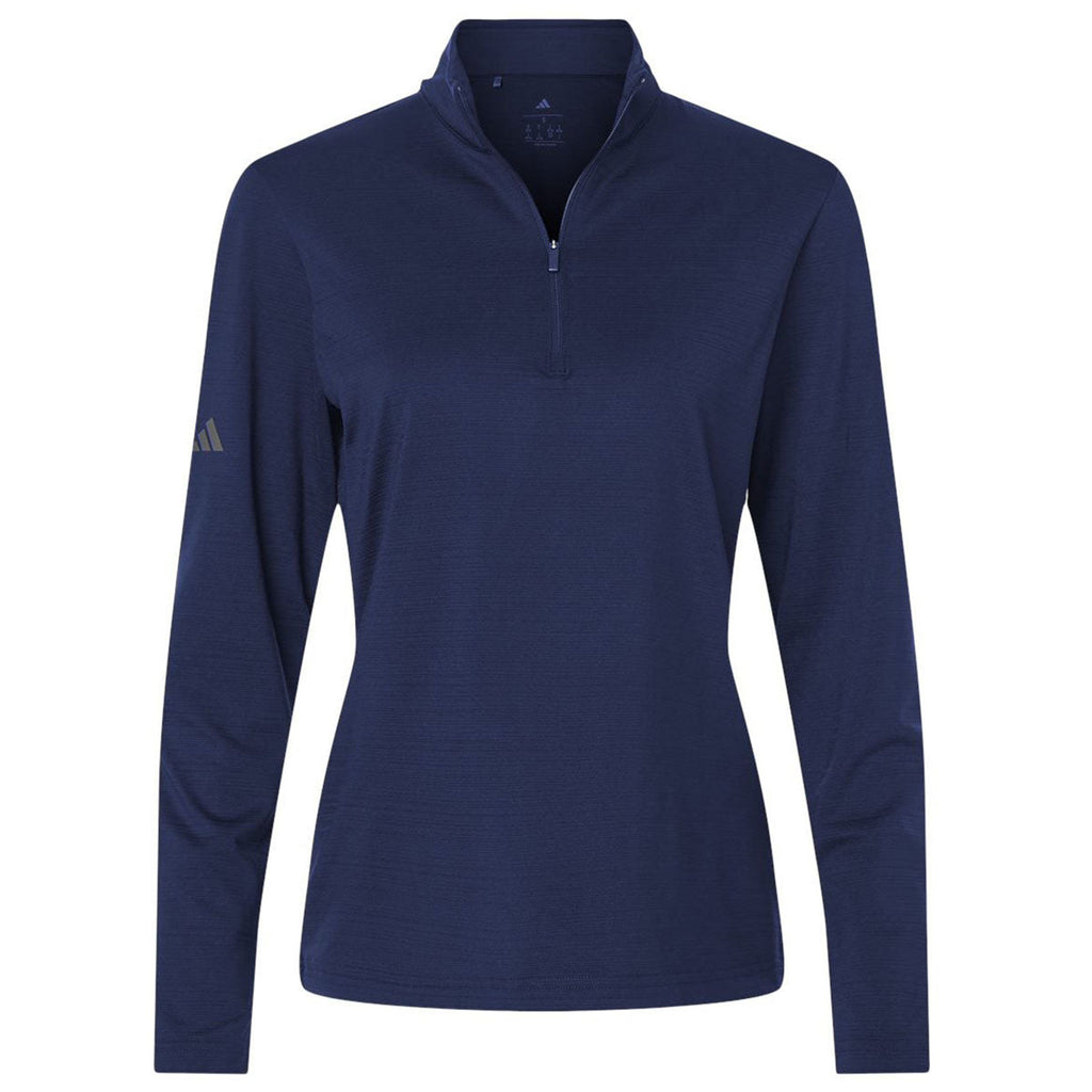 Adidas Women's Dark Blue Textured Stripe Quarter-Zip Pullover works well for corporate branding thanks to its streamlined fit and tonal stripe details. The breathable performance fabric keeps movement effortless, while the quarter-zip design supports quick layering changes. Wearers appreciate its balance of style and comfort, and organizations value its professional appearance for consistent team outfitting.This product can only ship within the United States.