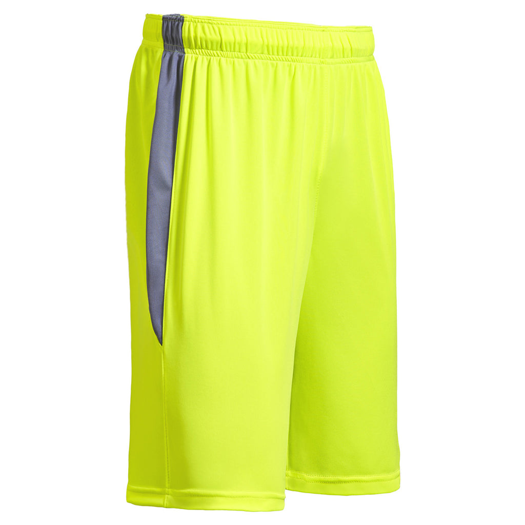 Tackle your workout regimen in Expert Men's Safety Yellow/Steel Outdoor Short that won't hinder your movement even during intense training activities. Sweat wicking shorts boast inseam with insert A-line side panel while an elastic waistband with adjustable draw cord ensures a custom fit. Contrast side panels make for a stylish touch. Anti-bacterial treatment keeps the garment fresher for longer. Active wear is among those few items that attract a broad audience, and these men's shorts being one of those items are customizable with logo imprint of your brand or company. It's perfect for corporate giveaways, dance studios, promotional merchandise.The minimum order for this product is 12 pieces.