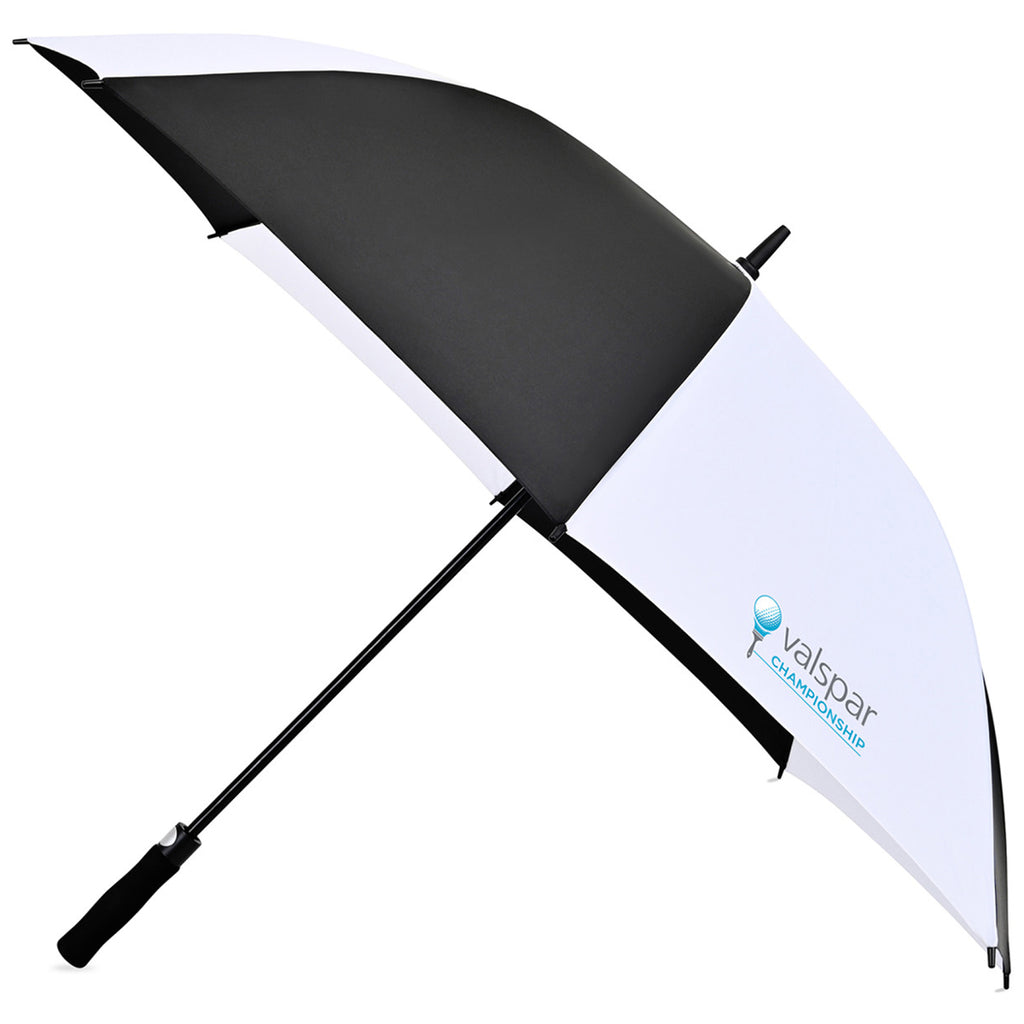 Stay dry with a custom Elements Black/White 60" Recycled Auto Open Golf Umbrella. This large umbrella is perfect for those spring showers that pop up in the middle of your game or to protect you from the sun. Made from recycled materials, the umbrella opens with a single click and closes in the same way. A wonderful gift.