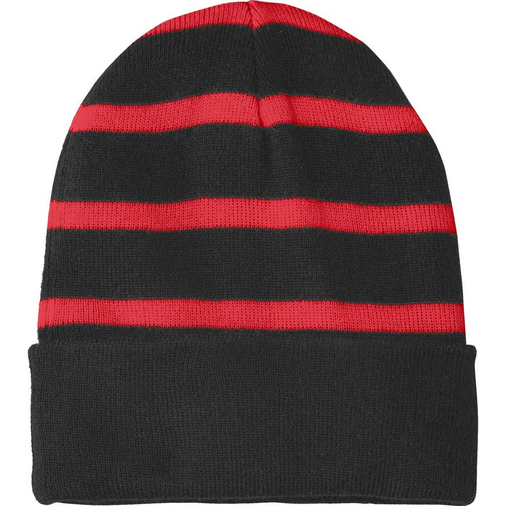 Sport-Tek Black/True Red Striped Beanie with Solid Band