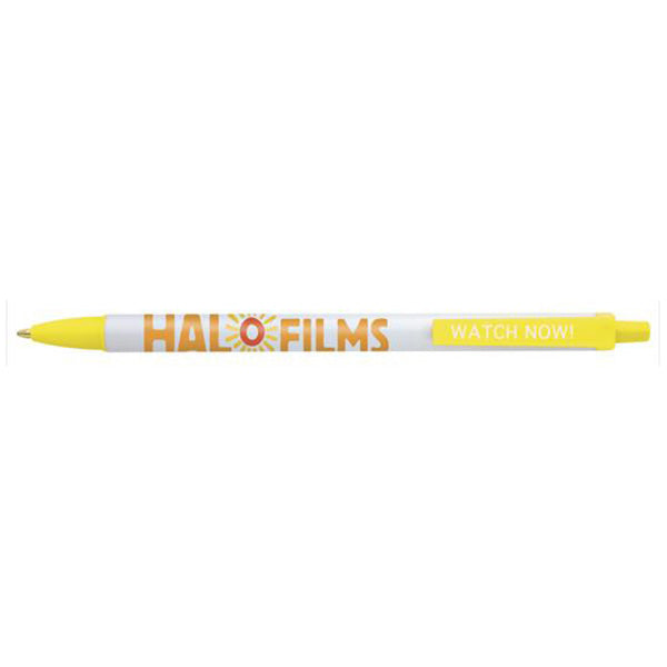 Good Value Yellow with Black Ink Contender Pen with a corproate brand is a cost effective way to showcase your brand or organization for the entire use of the pen. The practical design of this pen with a white barrel and contrasting trim means your name or logo will be the star. Great for giveaways, new clients, or general daily use. Order today.