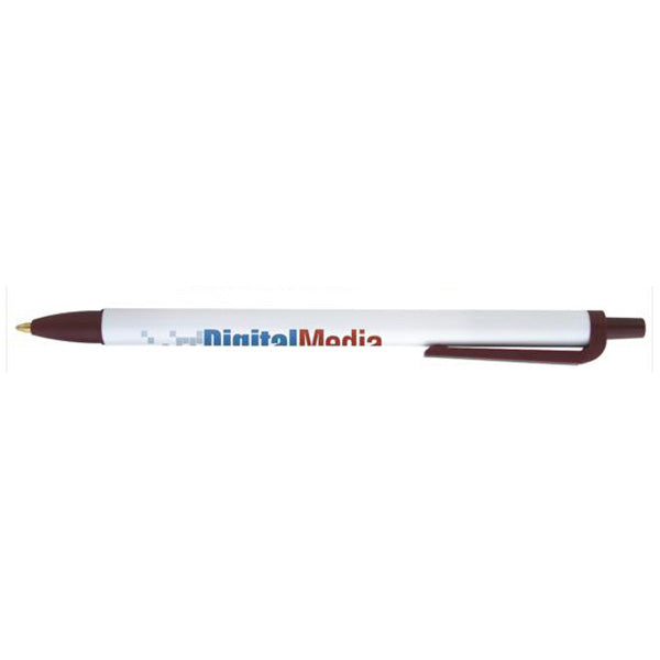 Good Value Burgundy with Blue Ink Contender Pen with a corproate brand is a cost effective way to showcase your brand or organization for the entire use of the pen. The practical design of this pen with a white barrel and contrasting trim means your name or logo will be the star. Great for giveaways, new clients, or general daily use. Order today.The minimum order for this product is 500 pieces.