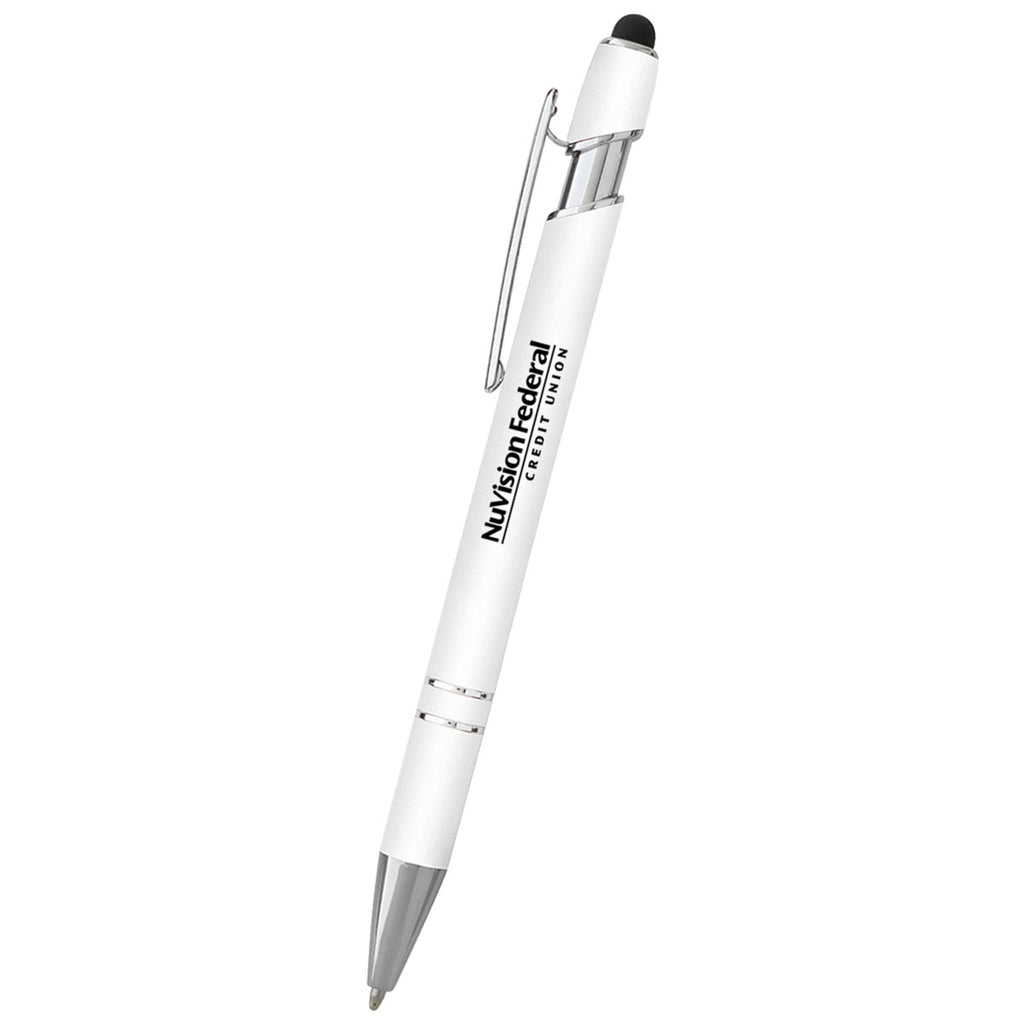 Hit White Incline Stylus Pen with a corporate logo comes in a variety of colors to fit your supply needs. The stylish pen serves the dual purposes of writing and serving as a stylus while coming in a convenient gift pouch for easy gift-giving. Great for new clients, graduations, or special events while networking.
