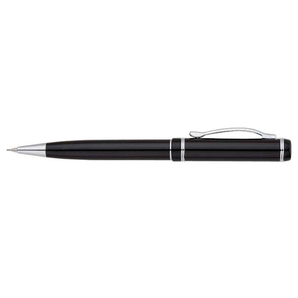 Jot down work notes or record an epic diary with this modernized classic twist-action set of Logomark Black Zara Ballpoint/Pencil Set which comes in a zippered case. You can have your logo custom engraved on the chrome-accented clip of both pen and pencil.