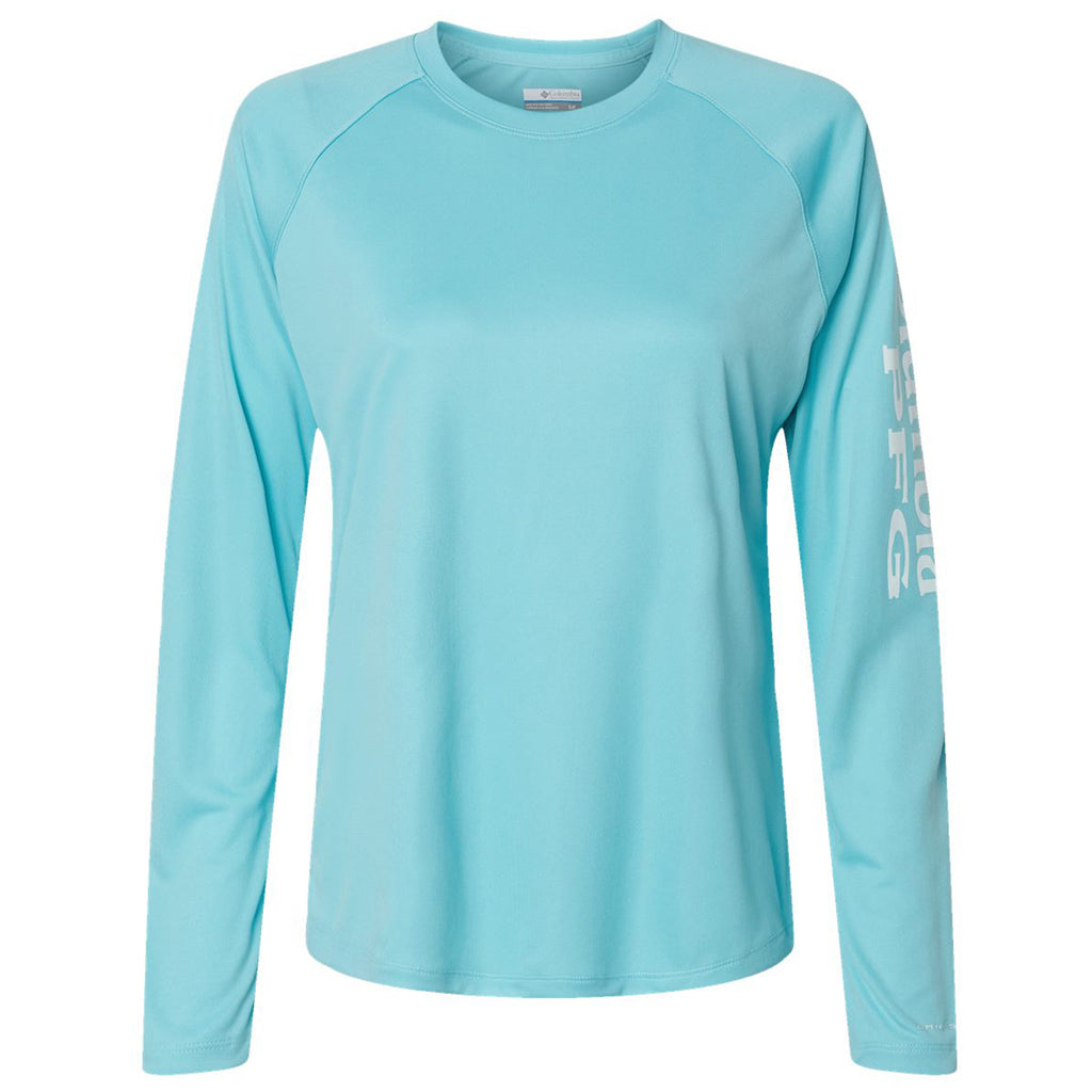 Columbia Women's Clear Blue/White PFG Long Sleeve Tidal Tee with a corporate logo is a fun and unique way to showcase your brand. The polyester long-sleeve tee has built-in sun protection of UPF 50, is quick-drying, and uses Omni-WICK. Perfect as uniforms for servers or those who work in retail or just to add to your apparel line.This product cannot ship outside of the United States.