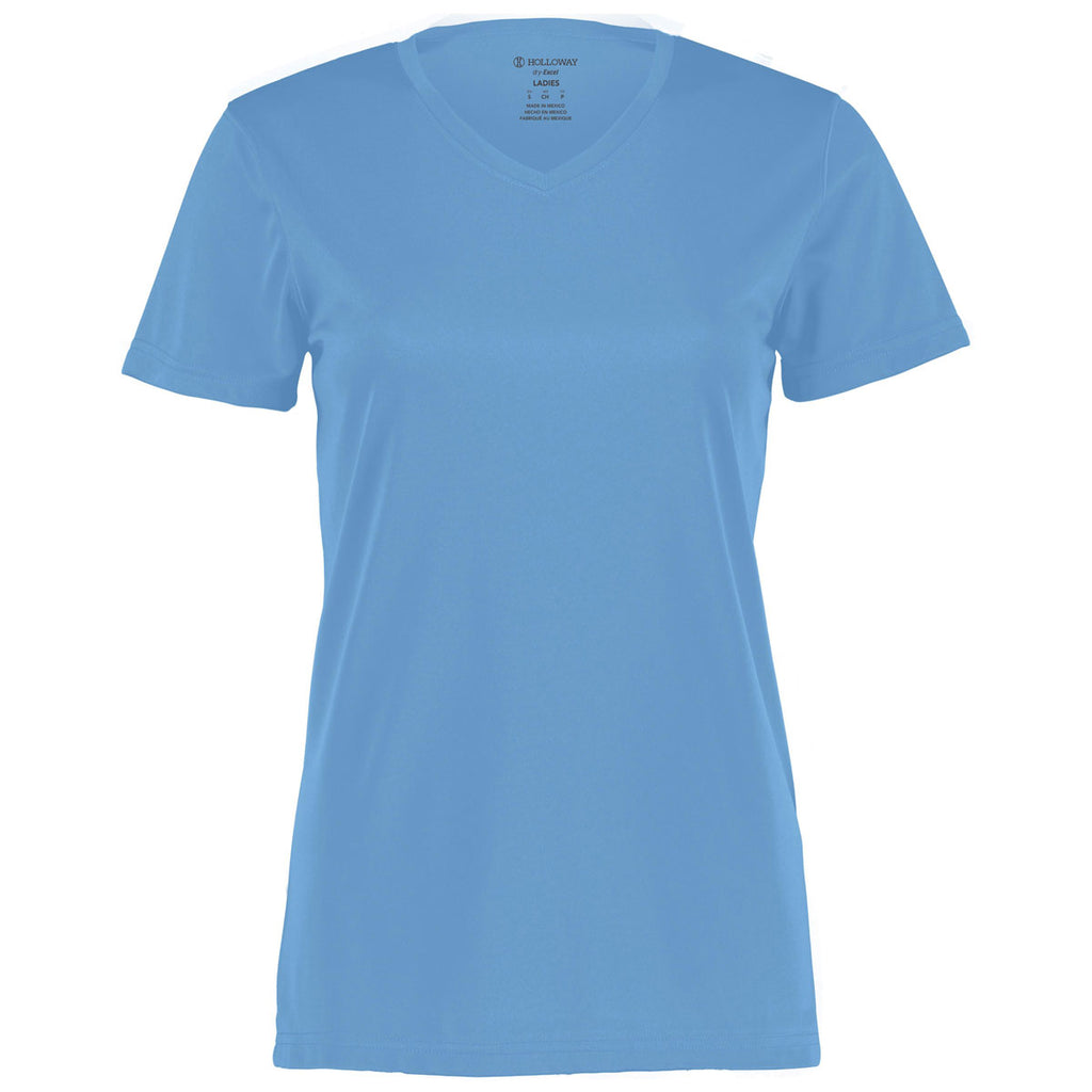Custom screen print will pop on the Holloway Women's Columbia Blue Momentum Tee. This simple, straightforward tee is a must have as daily comfort wear that can be dressed up or down as needed. A basic tee is a wardrobe staple that can serve many purposes. Add a company logo to use as part of a uniform or a custom design to show affiliation with a group, club, or team. The feminine fitting tee is color secure, wicks moisture, and is odor resistant with V-neck collar and set-in sleeves. The possibilities are endless with this tee, so place your order right away.Corresponding Men's Style:Holloway Men's Columbia Blue Momentum Tee
