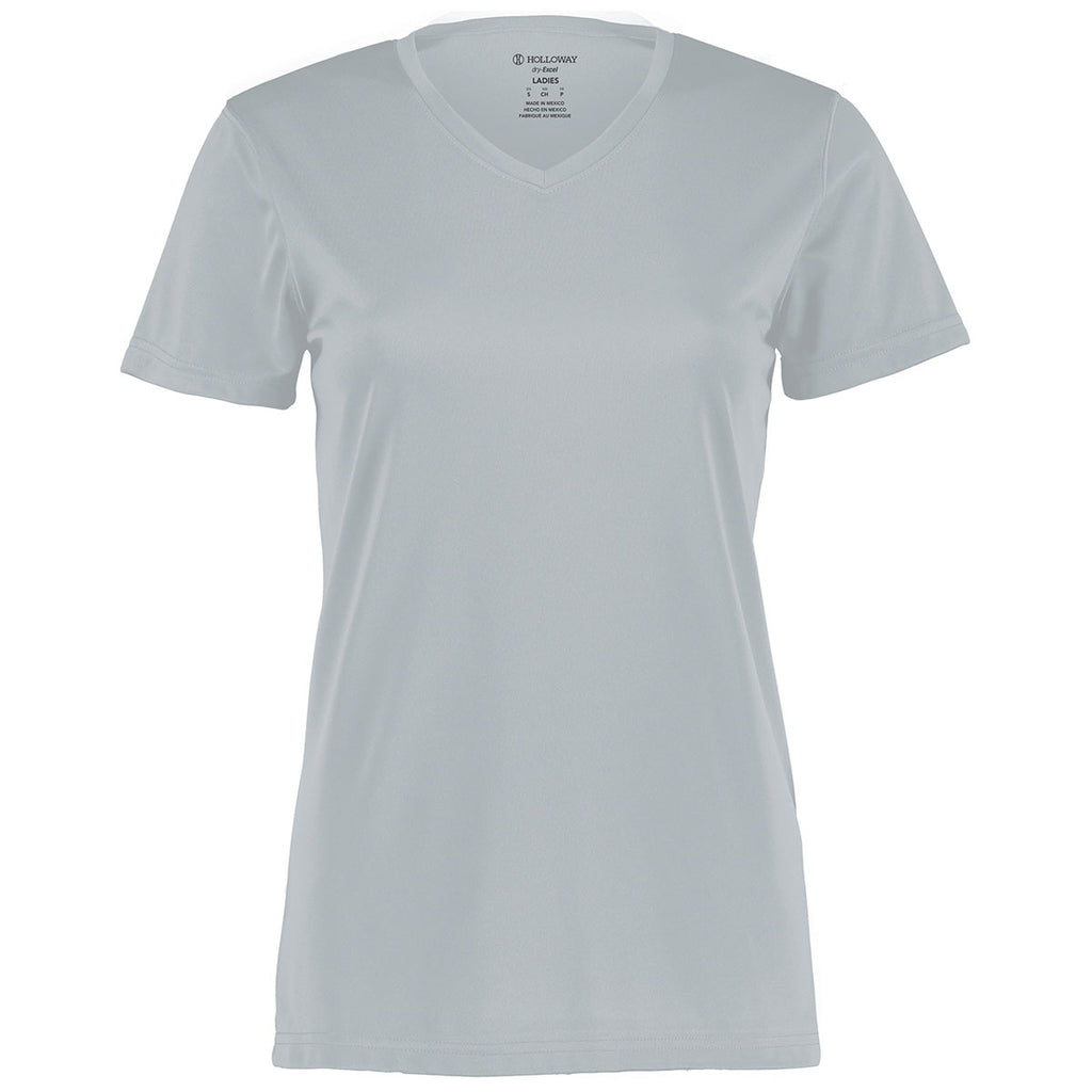 Custom screen print will pop on the Holloway Women's Silver Momentum Tee. This simple, straightforward tee is a must have as daily comfort wear that can be dressed up or down as needed. A basic tee is a wardrobe staple that can serve many purposes. Add a company logo to use as part of a uniform or a custom design to show affiliation with a group, club, or team. The feminine fitting tee is color secure, wicks moisture, and is odor resistant with V-neck collar and set-in sleeves. The possibilities are endless with this tee, so place your order right away.Corresponding Men's Style: Holloway Men's Silver Momentum Tee