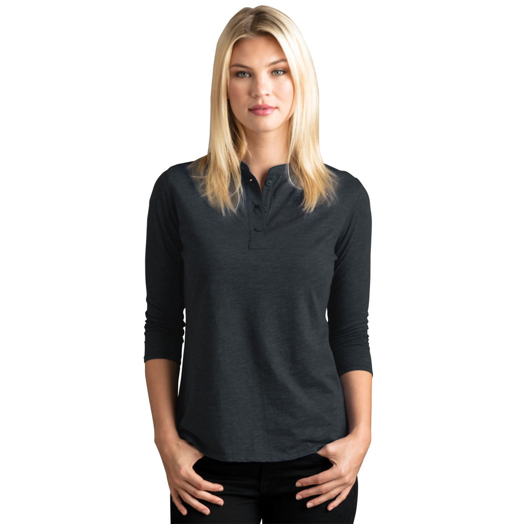 With a self-goods collar and three-button placket, the embroidered Vantage Women's Black Cambridge Henley sets the pace for casual corporate fashion. Enjoy the smooth feel of cotton and the tough performance of polyester while playing golf or working in the backyard. Add the curved hem bottom and you have a long sleeve shirt that will make a favorable impression on everyone you meet at industry trade shows. Even better, hand out the shirt to customer prospects to build good will. Make sure to attach your company logo on the large imprint area to stir interest for your brand.Corresponding Men's Style: Vantage Men's Black Cambridge Henley