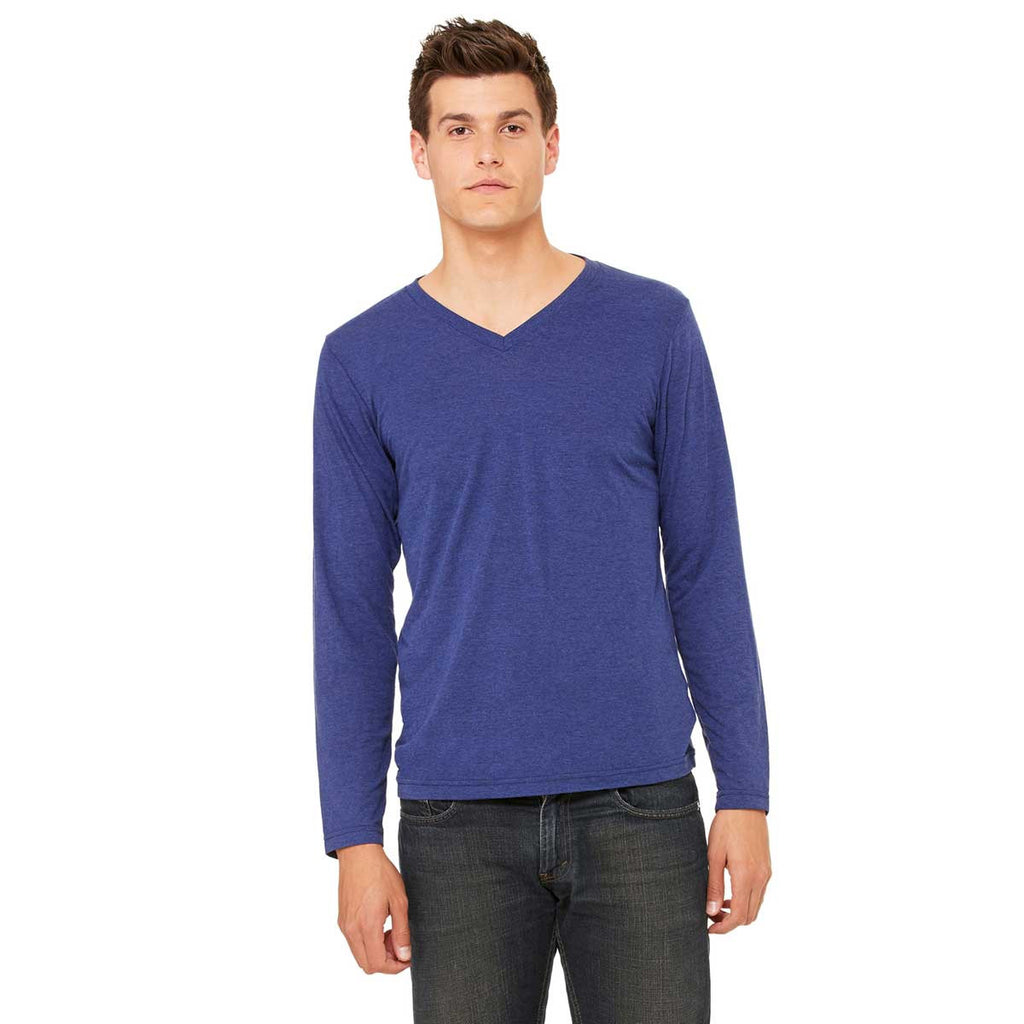 The Bella + Canvas Unisex Navy Triblend Jersey Long-Sleeve V-Neck T-Shirt offers you two different fabric options that match your fashion needs. Standard t-shirts contain 100% combed ring spun cotton that possess incredible moisture wicking properties. Wear the all-cotton version during an intense heat wave and never feel dampened by the day. The other t-shirt version blends cotton and polyester to boost performance for intense physical activities. Unisex sizing makes the t-shirt a hit at office holiday grab bag parties. Attach a custom logo to the large imprint area on the chest to reach more potential customers.Highlights