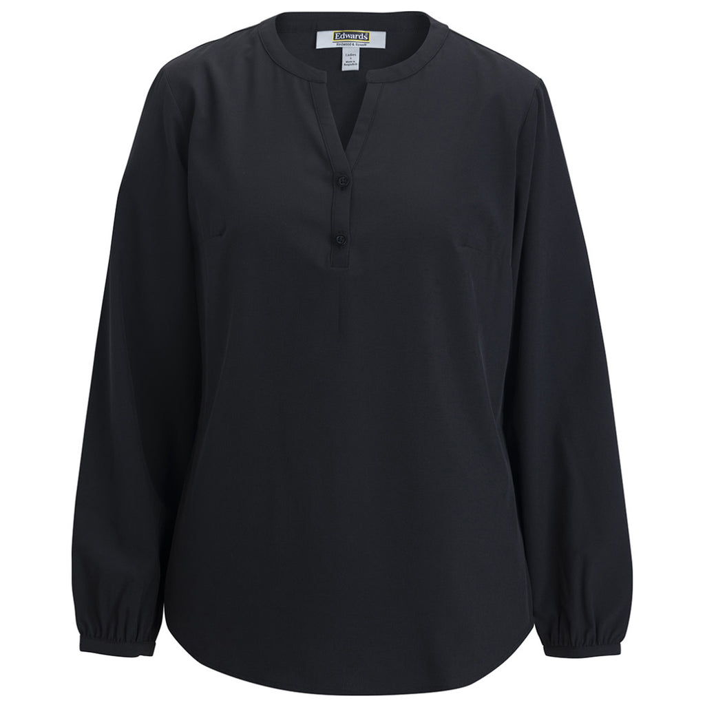 Edwards Women's Black Open V-Neck Blouse with custom embroidery is a high-end look that can be dressed up or down as needed. The flowy blouse with rounded split neckline and long-sleeves with gathered cuffs create a professional look for the office that easily translated to an evening out with friends. The wrinkle resistant blouse provides a traditional fit with a bit of flair. Order today.Highlights
