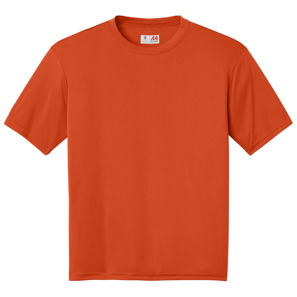 Keep cool with the A4 Men's Athletic Orange Cooling Performance Short Sleeve Tee. Built with moisture-wicking fabric, this tee is designed for workouts, sports, or active jobs. Customize it with your logo to create branded apparel that's functional and comfortable. Its lightweight design makes it a reliable choice for corporate promotions or team uniforms.Highlights