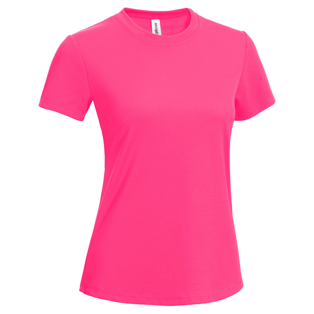 Expert Women's Hot Pink Short Sleeve Tee features short sleeves, crew neck and crafted from 100% microfiber polyester, available in a range of hues. Perfect for everyday wear or the most intense workouts, this tee comes in a relaxed fit in feminine contoured design. Soft, breathable fabric expertly wicks sweat to keep you as dry as possible. Treated with BodyFreshe to eliminate odors and inhibit odor-causing bacteria. Promote a healthy and active lifestyle with these workout-ready shirts, ready to sport custom logo imprint of your company.The minimum order for this product is 12 pieces.