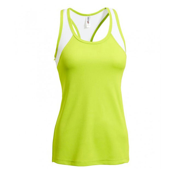 Head to the gym in this racerback-inspired Expert Women's Lime/White Distance Singlet that screams 'I don't glisten, I sweat' attitude. Self-binding neck and armholes ensure no-fuss movement of your guns. The racerback cut will make you feel workoutaholic the more iron you pump. Contrast panels add to aesthetics of this sleeveless workout top while a fold over pocket holds your essentials. Treated with antibacterial and sweat-wicking properties. Customize this women's singlet with your logo to bring your company to the public eye. Perfect for dance studios, gyms and other businesses related to active lifestyle.