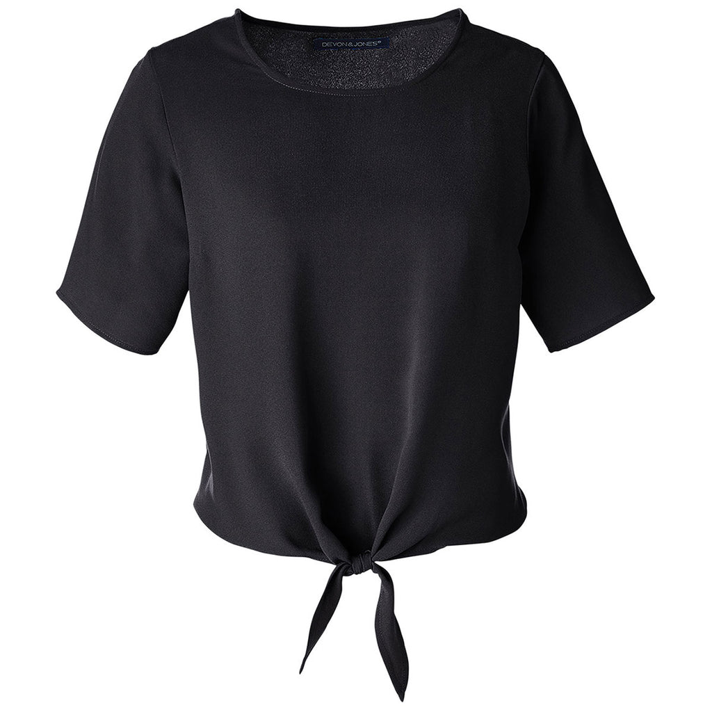 Add custom embroidery to the Devon & Jones Wome Black Perfect Fit Tie-Front Blouse for a look that is both fun and fashionable. A slight throwback with an updated approach, this blouse will get you noticed. Made of lightweight polyester crepe with a feminine scoop neckline, the tie-front detail at the center front hem makes this a true must have. Choose a company logo to use these as employee apparel or gifts that show creativity.Highlights