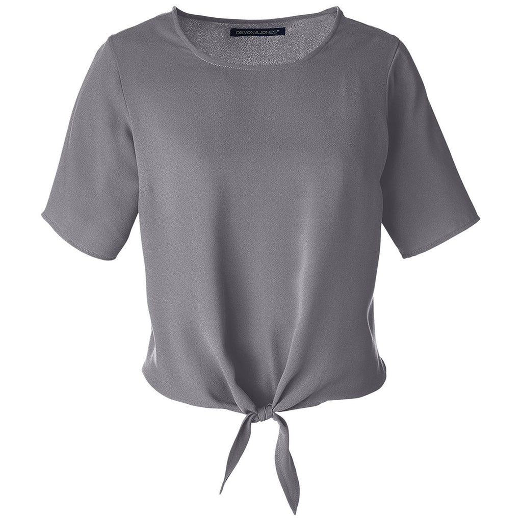Add custom embroidery to the Devon & Jones Wome Graphite Perfect Fit Tie-Front Blouse for a look that is both fun and fashionable. A slight throwback with an updated approach, this blouse will get you noticed. Made of lightweight polyester crepe with a feminine scoop neckline, the tie-front detail at the center front hem makes this a true must have. Choose a company logo to use these as employee apparel or gifts that show creativity.Highlights