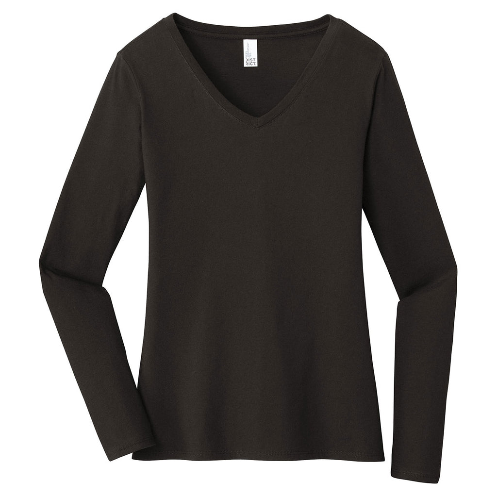 Before the next job fair, turn the corporate recruiting event into a display of fashion expertise by ordering the screen printed District Women's Black Very Important Tee Long Sleeve V-Neck. The multi-use long sleeve tee works as well as standalone corporate apparel at a casual restaurant, as it does as the first layer of a cold weather fashion ensemble worn on a weekend camping trip. One-hundred percent ring spun cotton feels soft against the body. Add a custom logo to connect with potential customers at civic events. The long sleeve v-neck tee is the ultimate company giveaway.Highlights