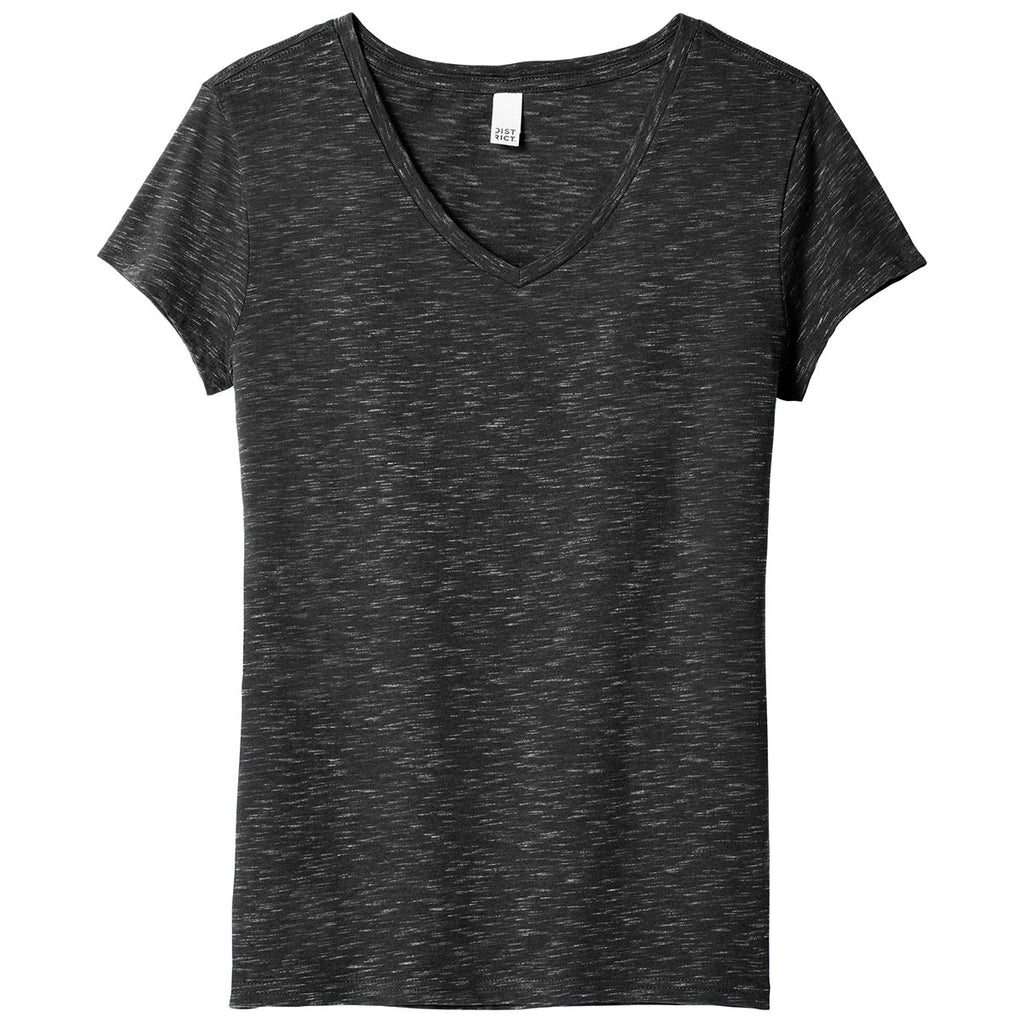With a relaxed fit that blends in seamlessly at company casual social events, the screen printed District Women's Black Medal V-Neck Tee is an excellent addition to new employee gift bags. Shoulder to shoulder taping produces a structured look that withstands the pounding delivered by active lifestyles. Enjoy the super smooth feel of 90% ring spun cotton, as well as polyester fibers that bind together to resist rips and tears. Wear the tee as an only layer at a picnic and as the first layer of a cool weather fashion ensemble. Attach your corporate logo for getting more exposure at industry trade shows.Corresponding Men's Style: District Men's Black Medal Tee