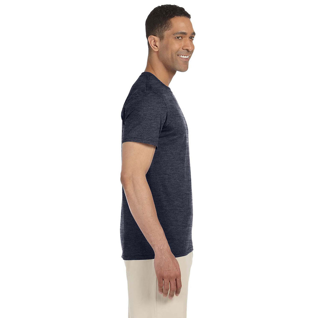 Generate a little employee swag by ordering the screen printed Gildan Men's Heather Navy Softstyle 4.5 oz. T-Shirt. Double needle stitching at the sleeves and bottom hem resist the types of rips and tears that eventually unravel inferior designed company shirts. Enjoy the super soft comfort of 100% preshrunk cotton underneath a dress shirt or as the lone layer for outdoor corporate events. Print a custom logo on the t-shirt to boost the image of your company at industry trade shows. The taped neck and shoulder combined the fashion elements of style and long lasting durability.Highlights