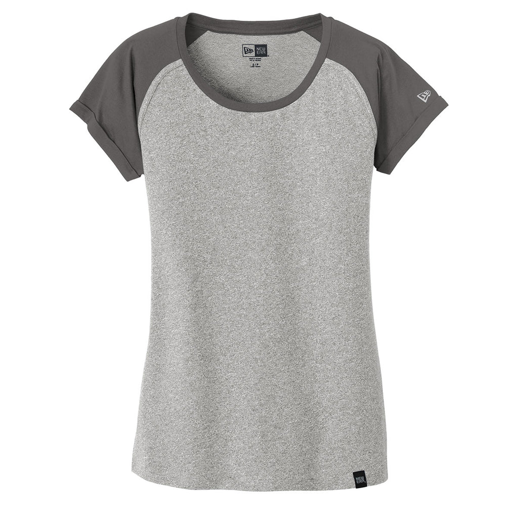 A unique color block design reveals a stunning appearance for the logoed New Era Women's Graphite/Light Graphite Twist Heritage Blend Varsity Tee. New Era combines plush softness and heritage motivated comfort to create a tee that maximizes comfort during your busy day. Reverse shoulder taping presents an appearance that your peers will immediately notice. Turn the compliments you receive for wearing the elegantly designed tee by attaching your company logo on the large imprint area. Rolled and tacked cuffs exude panache and the scalloped hem produces a symmetrical design worthy of winning fashion awards. Side vents double as style elements and areas for air to circulate near the body.
