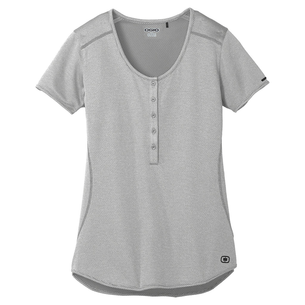 Switch up your usual corporate apparel orders by choosing the custom logoed OGIO Women's Rogue Grey/White Orbit Henley. The versatile company t-shirt presents a sleek scoop neck, open hem sleeves and cover stitching throughout the ladies shirt to take your corporate apparel to the next level. One-hundred percent polyester heather double knit jacquard presents a memorable appearance that gets you noticed at business seminars. Take advantage of the attention by attaching your corporate logo on the large imprint area. With a logo, you generate interest for your company at professional networking events.