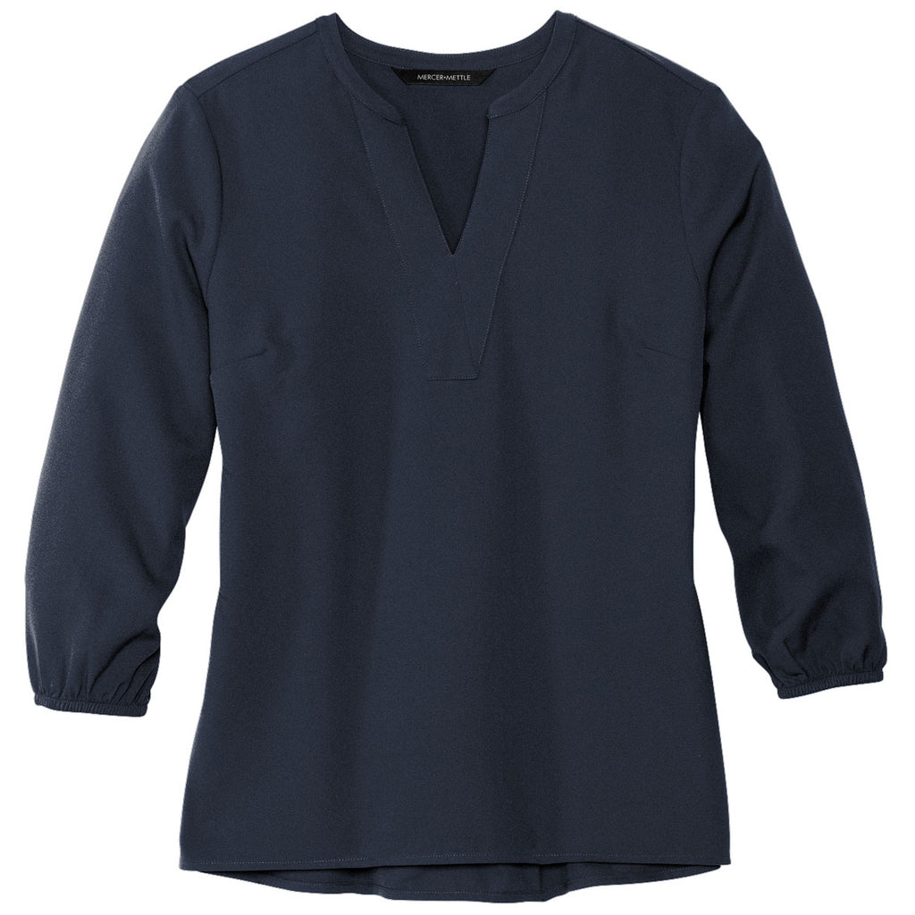 Mercer+Mettle Women's Night Navy Stretch Crepe 3/4 Sleeve Blouse with custom logo is a stylish desk to dinner option that can be appreciated by all. The crepe fabric provides a relaxed fit with elastic cuffs on the sleeves and a slight drop tail hem for a more elegant and covered look. Ideal for corporate and office apparel, so order today.