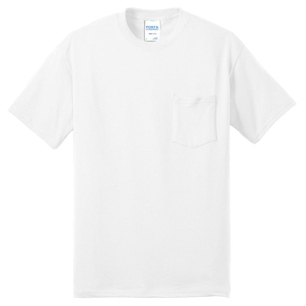 At the next company sponsored event, hand out the printed Port & Company Men's White Core Blend Pocket Tee to thank the loyal customers that have made your business a superstar in the community. Opposite the convenient left chest pocket is an area to attach a custom logo. With a logo, you connect with customer prospects at industry trade shows. Port & Co blends recycled polyester into the fabric not only to bolster the strength of the long lasting tee, but also to make an eco-friendly fashion statement. Super smooth cotton delivers all day comfort to keep you energized.Highlights