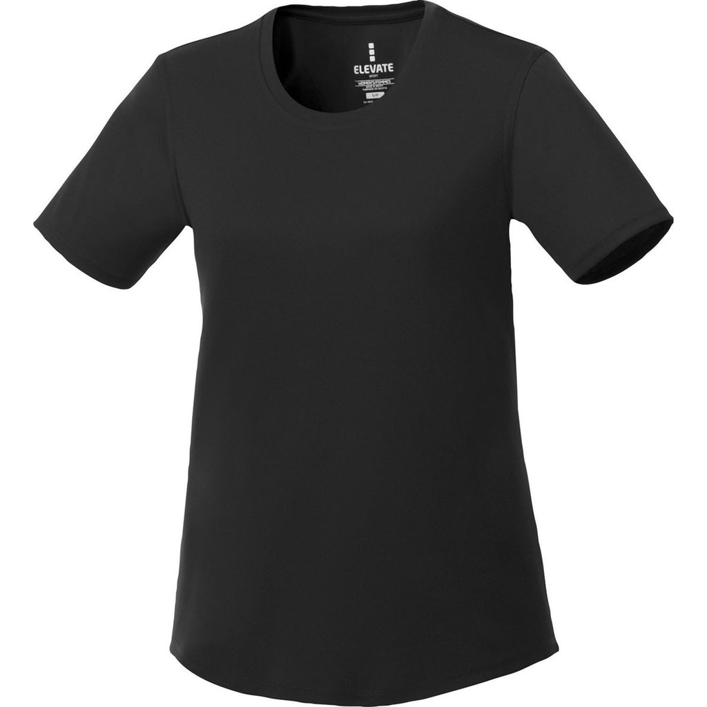 If you could build the ideal T-shirt for your next promotion, what elements would you include? You would probably look for durability, which means not only great fabric construction but attention to detail at the seams. And you would look for comfort, which is all about the quality of the fabric itself. That's not just icing on the cake; that's just as important as anything else. Of course, you can make it easy on yourself and just use this Elevate Women's Black Omi Short Sleeve Tech T-Shirt-then you'll have all of the quality with none of the hypotheticals. Just add on a custom corporate logo to brand this shirt as a gift, promotional item, and more.Corresponding Men's Style: Elevate Men's Black Omi Short Sleeve Tech T-Shirt
