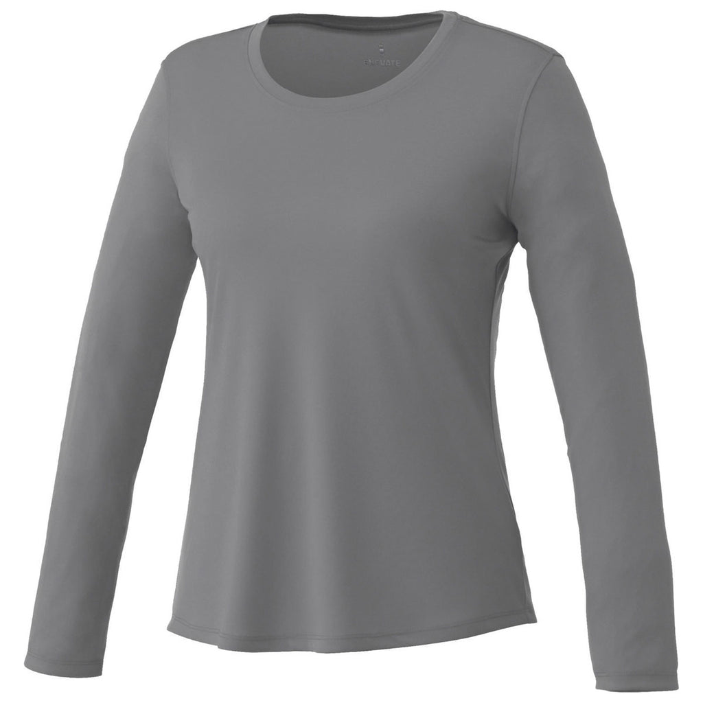 If you want to give your employees a gift which is perfect for every season, choose the Elevate Women's Steel Grey Parima Long Sleeve Tech Tee with your custom logo on it. This high-quality product will make your logo shine. Your female employees can wear it during summer nights or on cold and rainy days under a jacket. It is comfortable and stylish, which makes it ideal for outdoor activities. It will be your employees' first choice when they are biking, hiking, or jogging. Because of its classic look they can also wear it when they are running errands or picking their kids up from school.Corresponding Men's Style: Elevate Men's Steel Grey Parima Long Sleeve Tech Tee