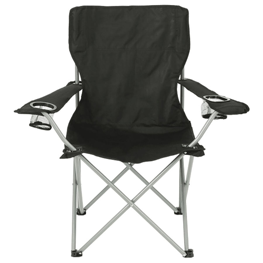 Boost your product offerings with the Leed's Black Game Day Event Chair, designed for ultimate comfort and durability. Made from sturdy 600d polycanvas, this chair supports up to 300lbs and features armrests with built-in cup holders. Its foldable design allows it to easily fit into the included carrying case with a shoulder strap, making it effortless to transport and store. Ideal for customization with your corporate logo, this chair is perfect for businesses looking to provide high-quality outdoor seating solutions for their customers.