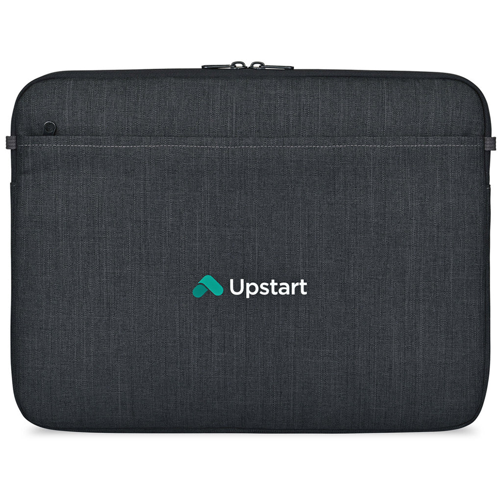 The Gemline Black Sand Alba 16" Laptop Sleeve with a corporate logo is a durable, eco-conscious way to stay organized and connected. The zippered and padded main compartment holds up to a 16" laptop and a front zippered pocket holds accessories. Perfect for the office, travel, or school when a laptop is needed.