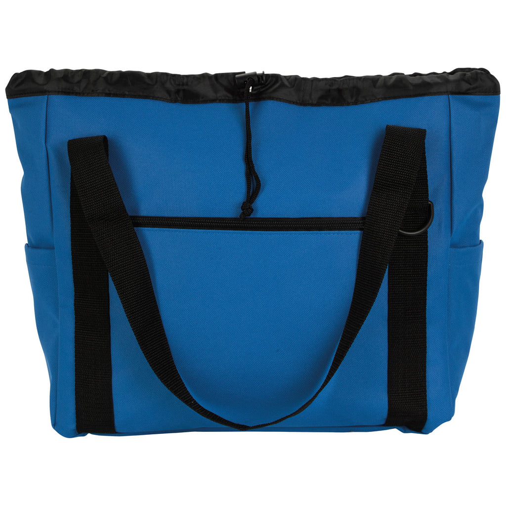 Enjoy the creative style of the custom Good Value Royal Convertible Cinch Tote-Pack with a logo in your unique design. This oversized cinch tote-pack is uniquely designed with long carry straps and a cinch close top that can be used open or closed as needed. Pack the large main compartment with files, books, notebooks, and more for your morning commute and then cinch it up to come home. A small front zippered pocket is great for keys, and side water bottle pockets keep you organized. Add a company logo to use at a trade show or recruiting event or fill it with goodies to create an impressive new employee welcome package. Place your order today.