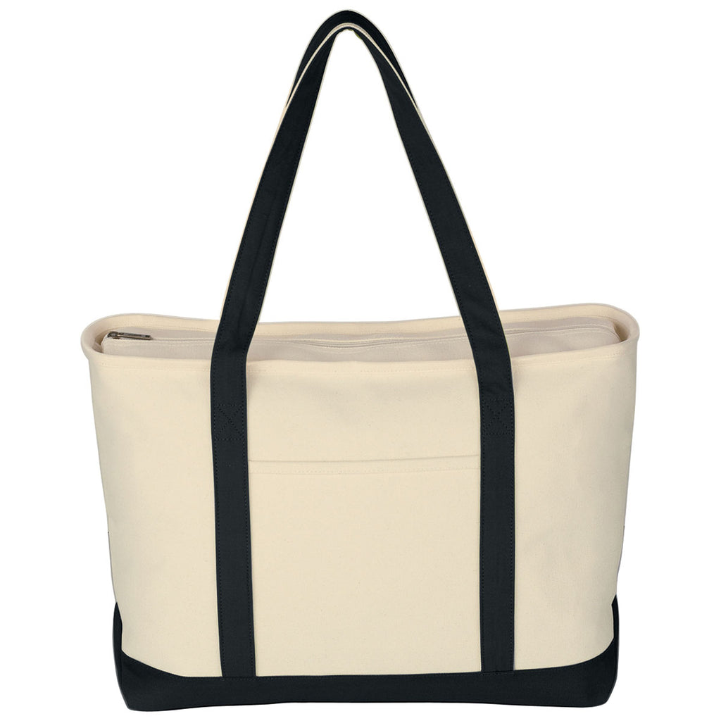 Enjoy the Hit Natural/Black Large Starboard Cotton Canvas Tote Bag with a custom logo. This neutral color bag has a bottom panel and shoulder straps in several color options to fit your needs. The ideal option for the beach, park, or road trip, the roomy tote zips closed for convenience. Give as a gift or add to your logoed items for sale.
