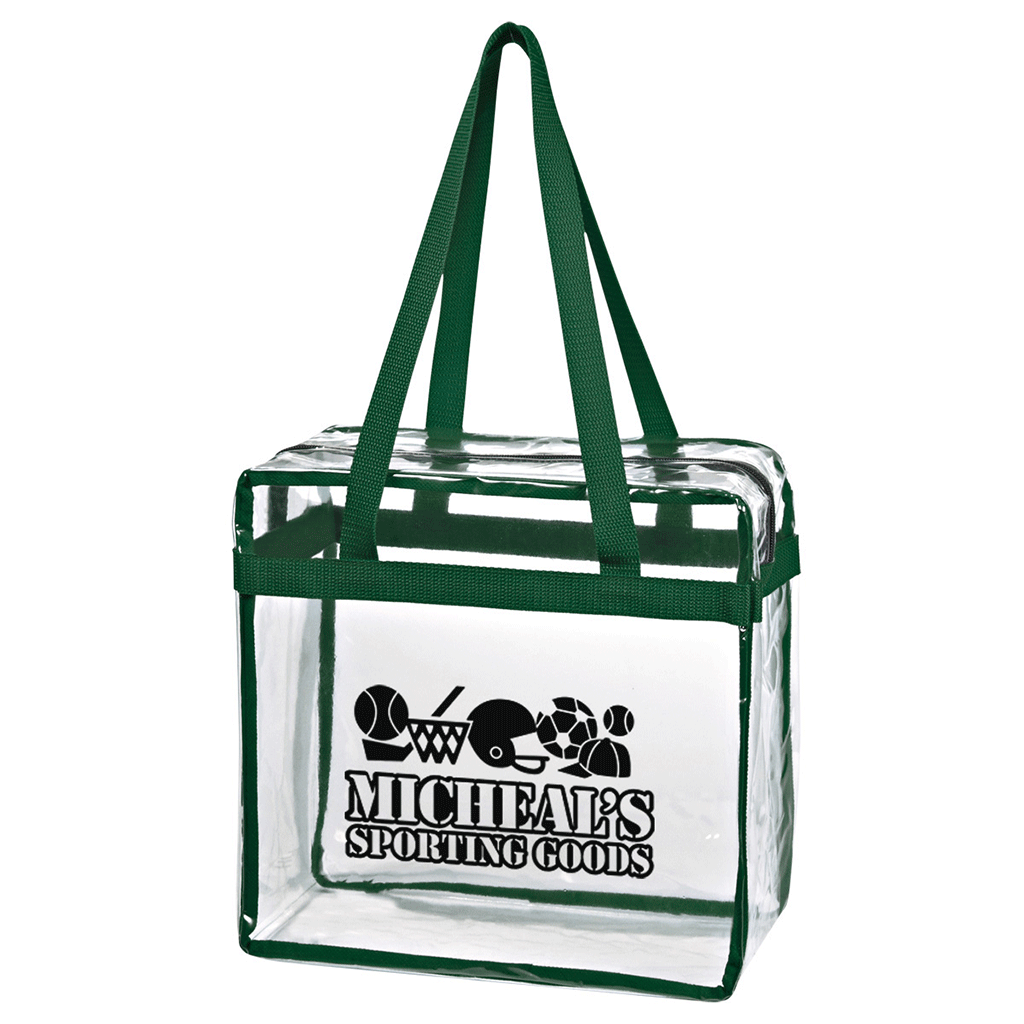 Stay organized with a custom Hit Clear with Forest Green Trim EVA Tote Bag with Zipper. This boxy tote is perfect for files, papers, or whatever you must carry to work, school, or activities. The clear tote with colored seams makes it easy to see what is in your bag and get through security when needed. Your logo will be the star on this zippered tote.