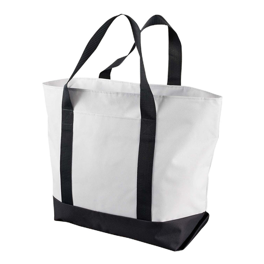 The minimum order for this product is 12 piecesYou arrive to a grocery store and find long lines at every checkout except the self-checkout lanes. Place the highly durable tote bag on the study metal next to the register and start organizing your food and beverages from the ride home. Why deal with flimsy paper bags, when you can rest assured the rugged cotton canvas tote bag never rips or tears. The UltraClub White/Black Bay View Giant Zippered Boat Tote bag includes a zippered main compartment large enough to secure everything you need for feeding your family. Add a custom logo to the large imprint area to create an effective way to promote your company in the community.