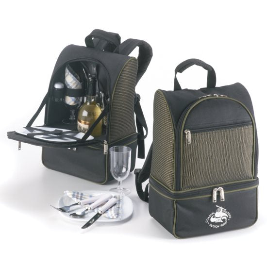 Made of 1200D polyester, the K & R Black The Impression backpack contains a two-person picnic set. It features bottle support pocket and a pair of all essential picnic utensils that will make you the envy of your beach pals. It can be customized with custom logo or image for corporate or promotional merchandising. The minimum order for this product is 12 pieces.Highlights