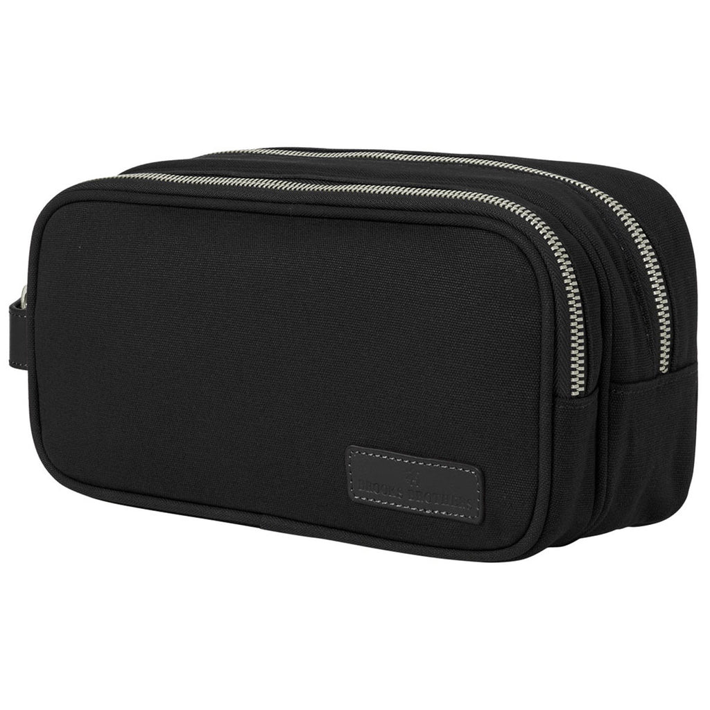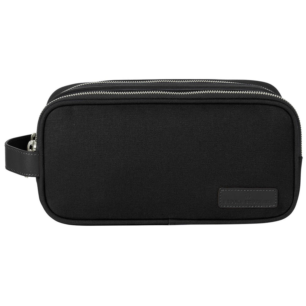 Brooks Brothers Wells Black Dopp Kit with custom logo created with heat transfer is a wonderful way to carry your necessities for the morning commute or on weekend adventures. The mid-size travel kit has a leather handle and metal sipper pulls with the Brooks Brothers logo. Place an order today to give these as gifts, employee incentives, or as a trade show giveaway.