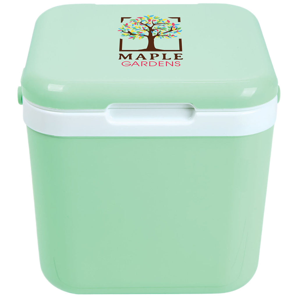 The Logomark Light Green 4.8 Qt Personal Lunch Box Cooler makes a practical custom gift for employee recognition or promotional resale. The compact size holds up to six cans and features a durable hard-sided exterior. The snap-shut lid and easy-carry handle make it ideal for worksites, outdoor events, or everyday lunch packing with your logo front and center.
