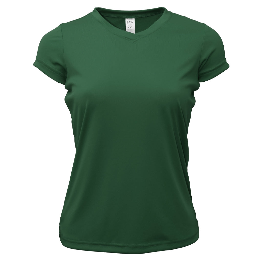 No one could accuse you of not selecting the right color of women's T-shirt for your company sponsored promotion! The BAW Women's Dark Green Xtreme Tek T-Shirt comes in a variety different shades. Just imagine your custom logo on the front of each one. Your promotion could be the gold at the end of the proverbial rainbow. This ladies' tee is available in sizes 2XS to 3X, and the material is so comfortable and breathable that recipients will wear it every chance they get. This is a tee that will not shrink and also offers UV protection. Whether you're having an anniversary celebration or gift with purchase, you just can't go wrong!Corresponding Men's Style: BAW Men's Dark Green Xtreme Tek T-Shirt