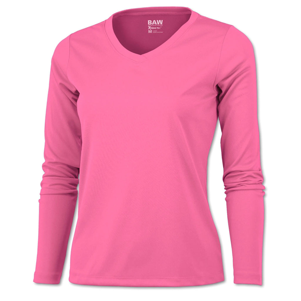 What woman wouldn't be pleased to receive the BAW Women's Light Pink Xtreme Tek Long Sleeve Shirt? It has quality sewn in from shoulder to bottom hem. What will make this shirt even more attractive is your custom logo in bold across the front. You have so many choices in color from bright red to orange sherbet. When people see your logo on a quality shirt, they automatically think of you as a quality company. Prospective customers will have already been introduced to your name - all you have to do is close the sale! Custom logoed shirts have always been a great incentive product.Corresponding Men's Style: BAW Men's Light Pink Xtreme Tek Long Sleeve Shirt