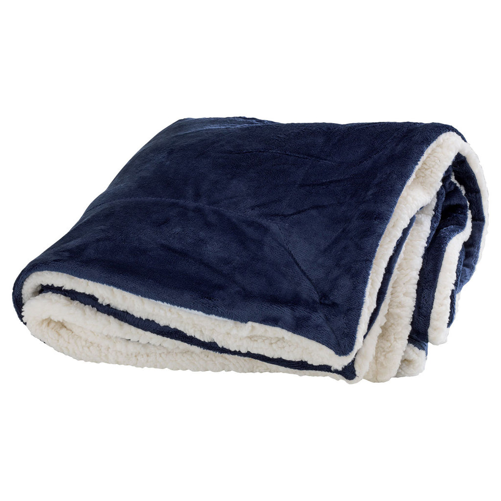 Stay warm on frigid winter days by covering your body with the embroidered Vantage Navy Faux Mink Sherpa Blanket. Ideal as an extra blanket for your bed, or as another layer to keep you warm in a sleeping bag. The Sherpa blanket contains faux lamb's wool that delivers supreme comfort. The 100% polyester fabric resists the rips tears making it durable without sacrificing comfort. The concealed zipper located in the corner hem makes it easy to pack while traveling. Add your corporate logo to have an excellent gift at your company's next recruiting event.Highlights