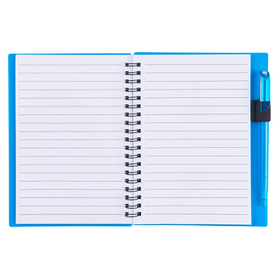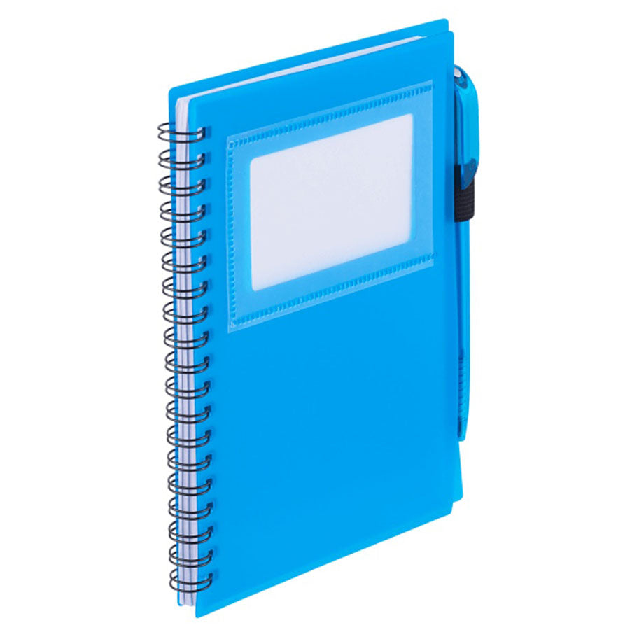 Impress your clients with the Bullet Translucent Blue 5.5'' x 7'' FSC® Mix Star Spiral Notebook with Pen, a perfect blend of convenience and eco-friendly design. This versatile notebook features a polypropylene cover and includes a transparent display window that holds IDs or business cards up to 2.0" x 3.5". It comes with 70 ruled sheets of FSC® Mix paper, a built-in pen holder, and a twist-action ballpoint pen. Perfect for professionals, this notebook combines convenience with functionality. Order in bulk today to offer your clients a stylish, practical notebook that makes a lasting impression on their professional image.