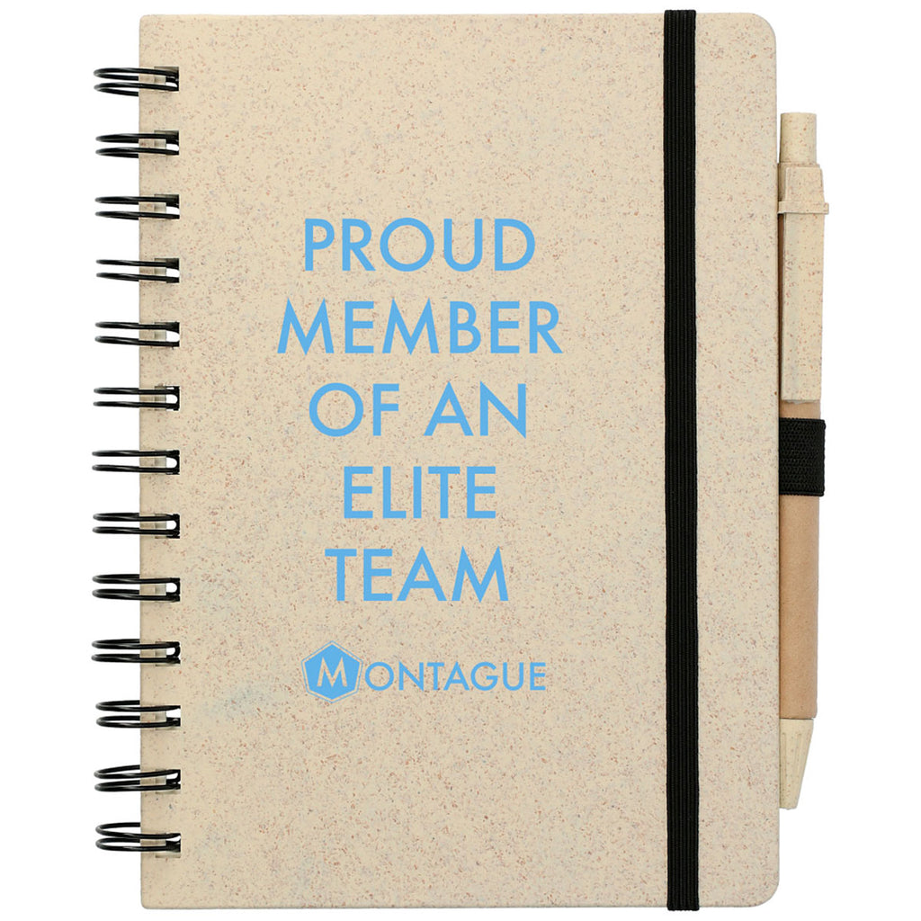 - The 5" x 7" Wheat Straw Notebook With Pen features 51% wheat straw cover. Black elastic closure and pen loop. 70 sheets of recycled lined paper. Wheat straw color matching pen with black ink cartridge.