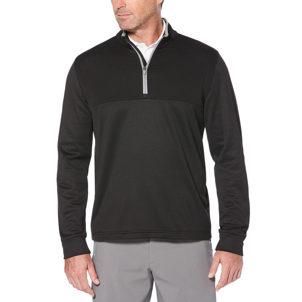Whether headed to a golf event or just in need of comfortable corporate apparel, the Callaway Men's Black Ottoman Fleece Pullover is perfect. Add a company logo to use 1/4 zip as employee apparel for trade shows or every day use as it looks professional while offering full range of movement. Available in peacoat and black, the top portion is in Ottoman style with lined look and a contrasting zipper color. Fitted comfortably, the 1/4 zip with a custom logo is a must have look no matter what activity, work or play. Place an order for just a few or an entire batch to help yourself and your employees look their best each day.