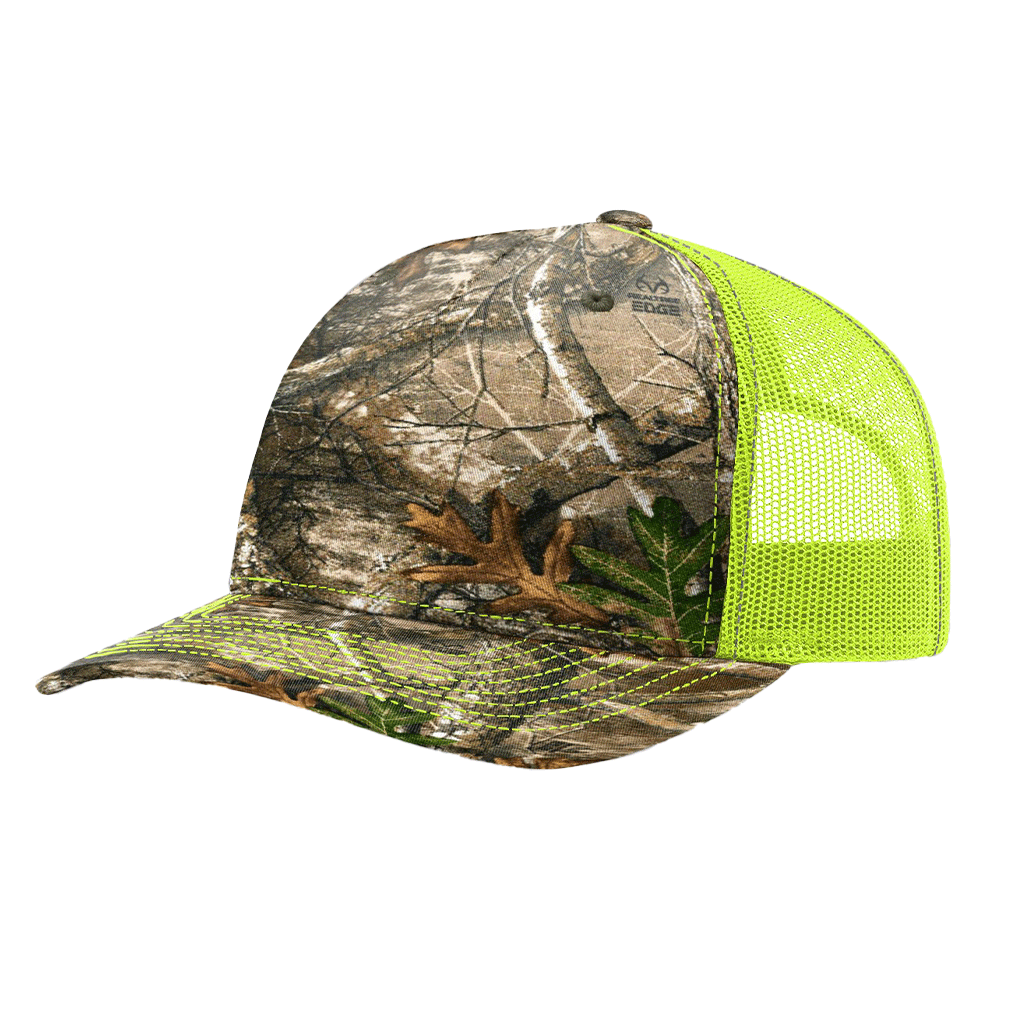Add embroidery to the Richardson Realtree Edge/Neon Yellow Printed Five Panel Trucker Hat for an easy-to-wear look that is ready for a hard day at work or play. The 5-panel pinch front construction with a camo print will be a hit for hunters, fishers, or those who enjoy the outdoors. An adjustable back means a one-size-fits-most fit. Place an order today.The minimum order for this product is 48 pieces.