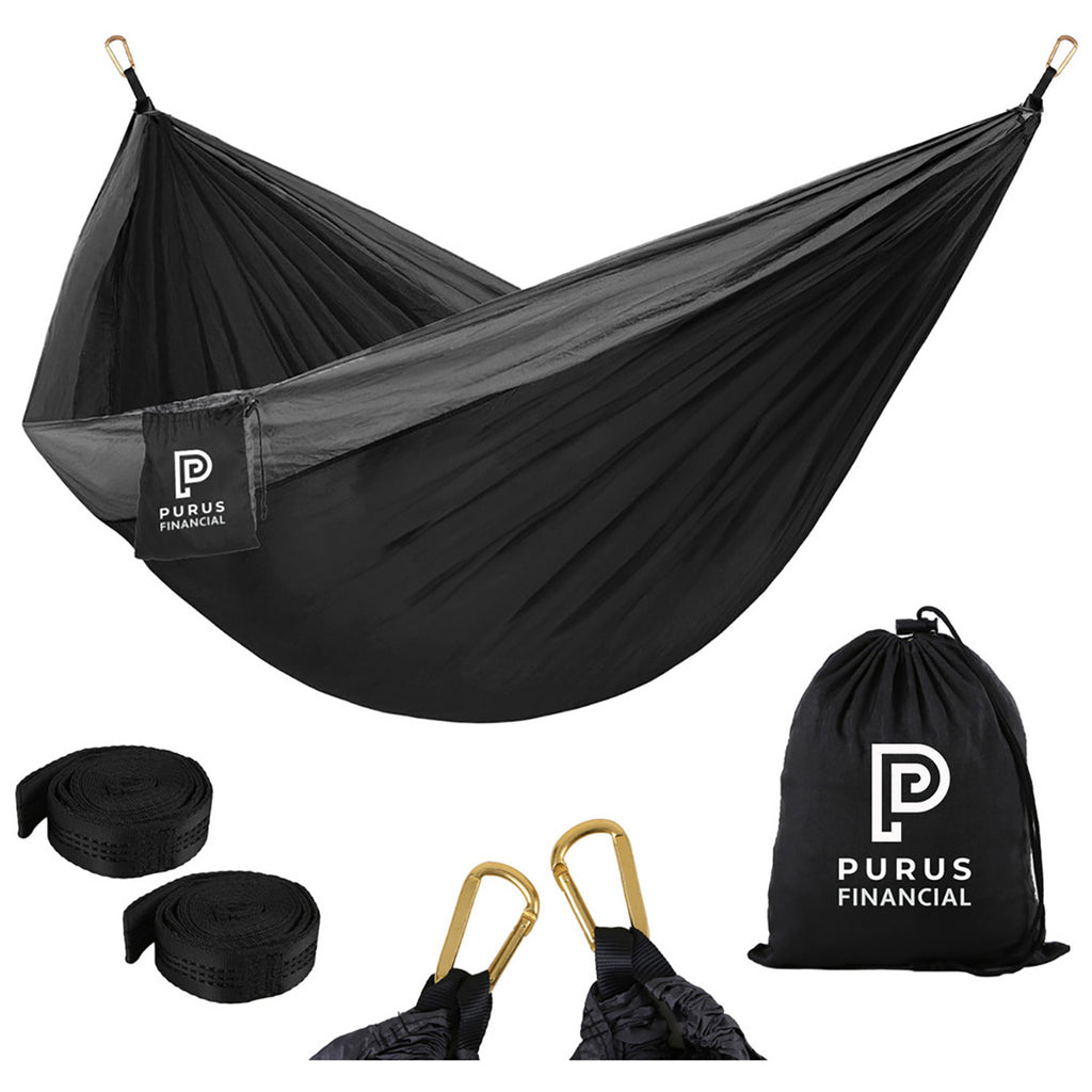 Origaudio Black The Hangout Portable Hammock with a custom logo is an adventure-ready essential for relaxation. The durable hammock comes with setup hardware for tree suspension. Grab the convenient carrying bag and take this hammock on a day hike, camping, or to relax after the hunt. Perfect as an addition to hunting and camping stores. Order today.