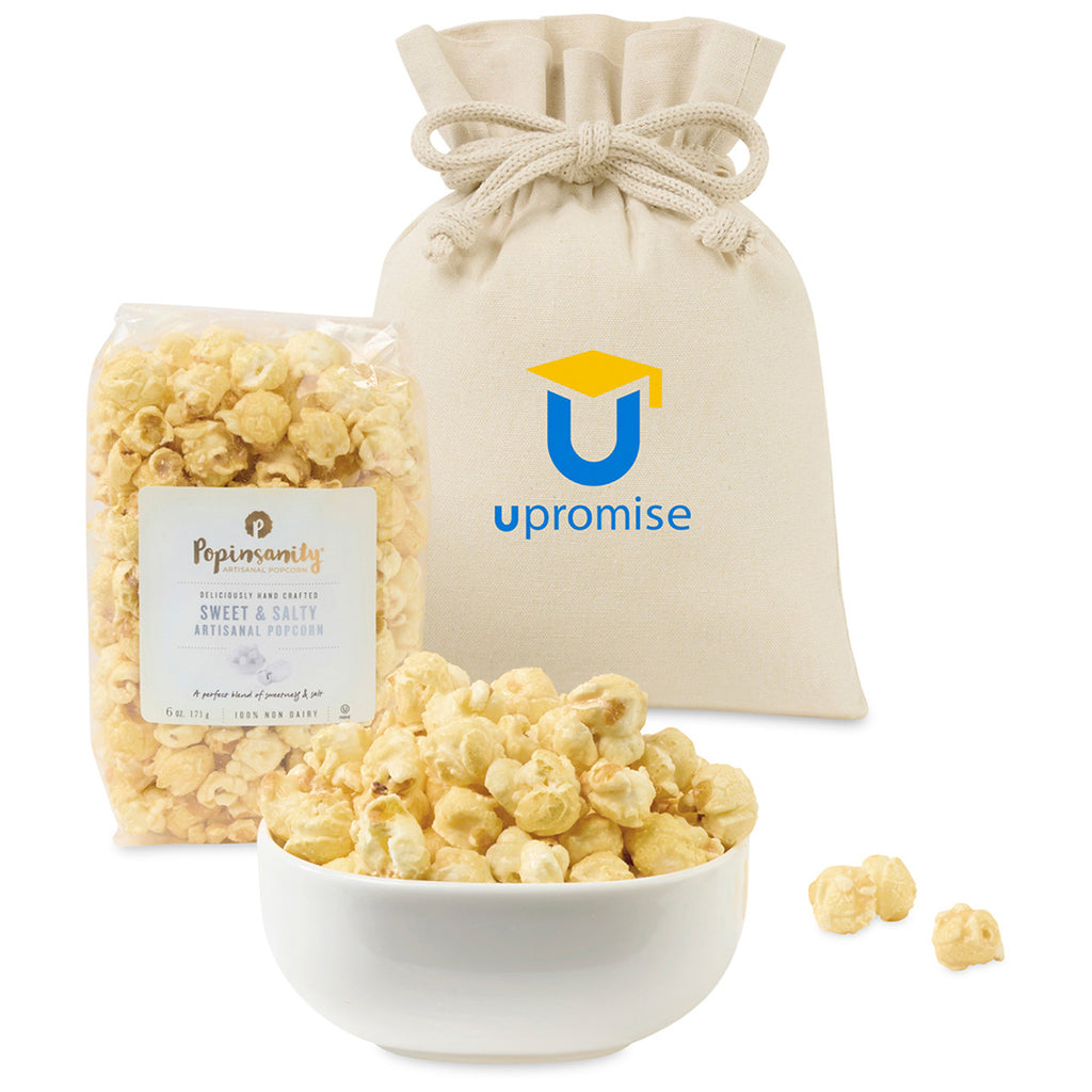 Gourmet Expressions Sweet & Salty Endless Poppabilities Gourmet Popcorn with a corporate logo is a fun way to reward employees with a gift for a special occasion or the holidays. Available in three artisanal flavors in a medium drawstring bag, this snack is dairy-free, kosher, and delicious. Order every flavor to stock a break room and keep staff happy and well fed.