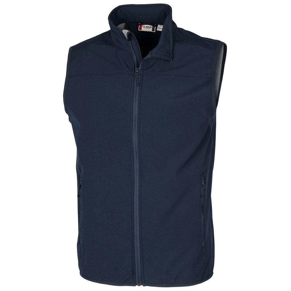 The Clique Men's Dark Navy Trail Softshell Vest offers lightweight coverage with stylish features. The custom logo vest comes in a selection of classic colors and includes many welcome features such as a 96% polyester/4% spandex blend material, full zip front closure, zippered pockets, waterproof features, and bonded microfleece lining. Add your company logo to the men's vest and give it away at upcoming corporate events, such as golf events or recruiting events. You can even order a few extra and save them for your employee's holiday gifts.Corresponding Women's Style:Clique Women's Dark Navy Trail Softshell Vest