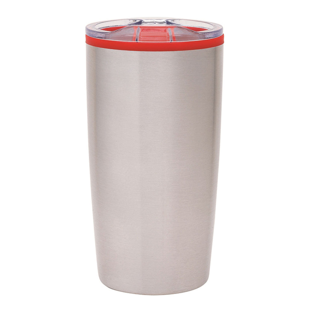 Make most of your favorite beverage with this Valumark Red Outback 20Oz. Stainless Steel Tumbler that retains optimum temperature thanks to double-wall insulation and plastic inner wall. It has a clear lid and equipped with colored slide closure. Give away this tumbler as a custom gift with your company's logo to prmote your brand with each sip.